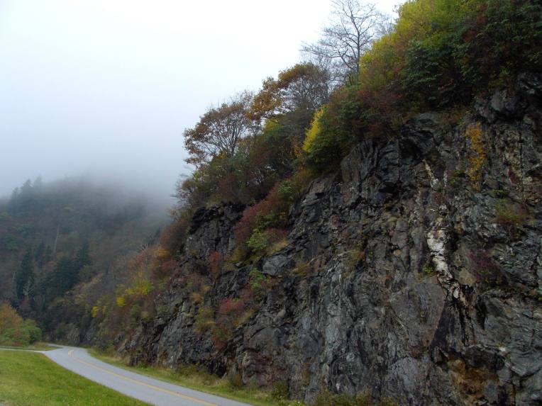 Well, it’s “Lingering Visions'” fault. I saw her photo for this challenge, and it was so beautiful that I had to stop and gaze at it. That’s when I realized she was talking about Bob and his challenge. I hopped on over to Bob’s place, and the site itself is a work of art and inspiration. I decided to offer my own contribution this week. I call it “Comin’ Round the Bend,” and it shows a most colorful rock formation on top of the Blue Ridge Parkway — in Southeast U. S. It was a very cloudy day, and you can see a rainstorm just starting to move in — which I think adds to the power of the picture. But within minutes, we were enveloped in the storm cloud itself. Hope you enjoy this.